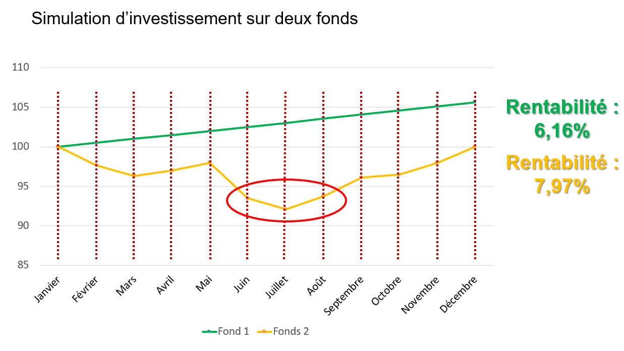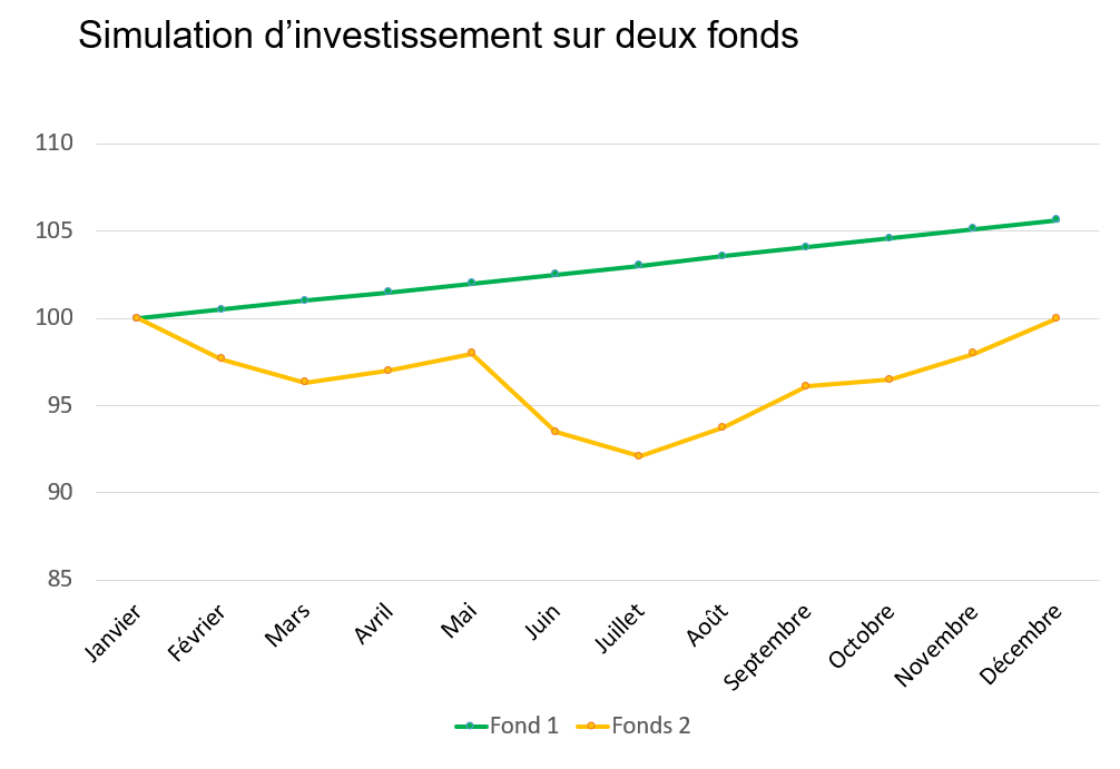 Pour bien vous l’expliquer, je vais prendre deux fonds d’investissement. Le fonds n°1 en vert et le fonds n°2 en jaune.